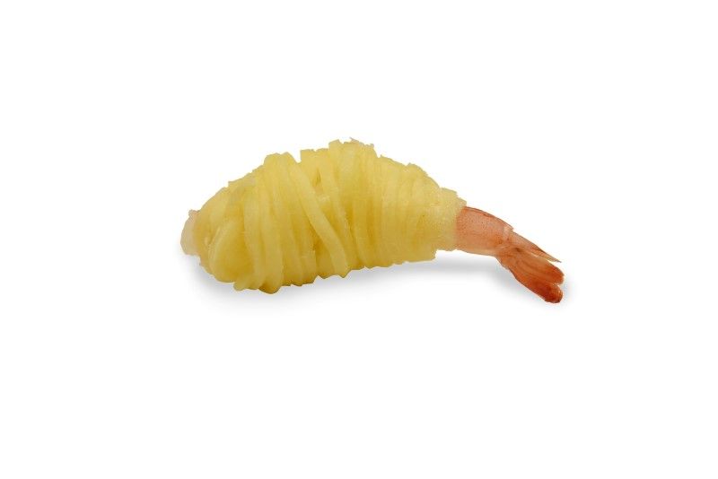 Potato strings wrapped around a whole prawn.